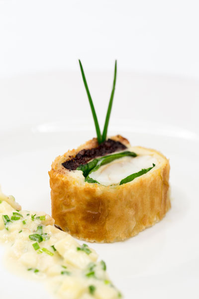 Steinbutt-Blutwurst Strudel|Apfel|Meerrettich