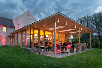 Als wir gegen 18 Uhr ankamen wurden wir mit einem Glas Prosecco empfangen, dann ging es gleich durch die Vorbereitungsküche zum neu errichteten Grillpavillon im Garten des Klosters. Grillmeister Philipp begrüsste uns gleich mit einem leckeren PASTRAMI-SANDWICH AUS DER RINDERHÜFTE AN SENFBUTTER – ich liebe Pastrami. Der perfekt ausgestattete Grillpavillon ist rundum verglast und liegt mitten im Grünen, auf der Terrasse stehen etliche Weber Grills in allen Ausführungen und Variationen – die optimale Grill Lokation. Natürlich sind in jeder Ecke etliche Weber Produkte repräsentativ aufgebaut – die haben schon so einiges an mehr oder weniger sinnvollem Zubehör zu bieten.