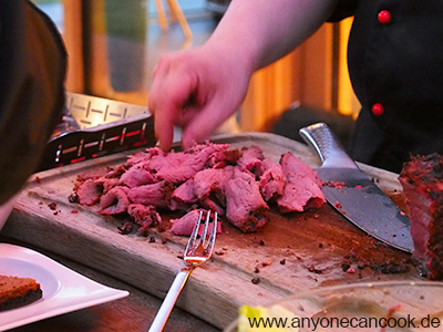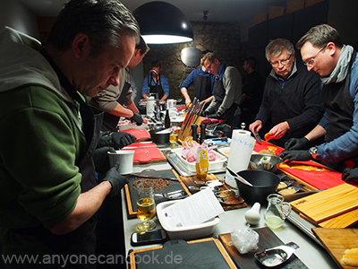 Nachdem das zweite oder war es das dritte Tablett Bier verteilt wurde, ging es geschlossen in die Vorbereitungsküche, in der es dann richtig zur Sache ging. Die Teilnehmer verteilten sich an die vorbereiteten Arbeitsplätze. Es wurde Mayonnaise geschlagen, Pfeffer geröstet, Hähnchenflügel mit Bier Infusion gespritzt, Schokolade gehackt, Kalbsrücken mit Thunfischmasse gefüllt usw… . Die Qualität der Produkte wahr absolut Top, was den recht hohen Preis von 130€ pro Person wieder ins rechte Licht rückte. Die Versorgung mit Bier nicht zu vergessen, da kam nämlich schon wieder das nächste Tablett. In ca. 30 min wahr alles gerichtet und es ging wieder raus ins Pavillon.